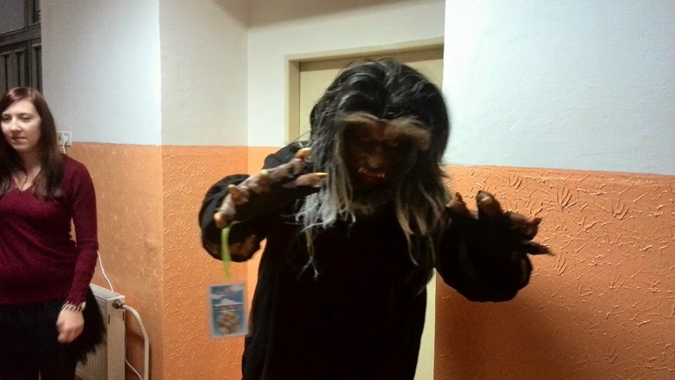 Předběžně jsem počítal, že líčení a lepení zabere tak 2 hodiny, celkem jsem to trefil. Stejně jako na Adviku probíhala maskérská práce ve workshop místnosti spolu s aktuálně probíhajícím programem, což bylo 3D origami s Jejkou. Během líčení jsem samozřejmě na sebe neviděl, „publikum“ reagovalo velmi pozitivně. Kvůli nalepeným zubům dentální pastou jsem veškerou komunikaci omezil na vzkazy na tabuli a následně vrčení. Zelené kontaktní čočky jsem sice měl taky v zásobě, ale ani po hodině pokusů za mohutného povzbuzování (a motivace Jestli to nezvádneš, nasadím si je já.) Mešitky jsem si je nedokázal nasadit.